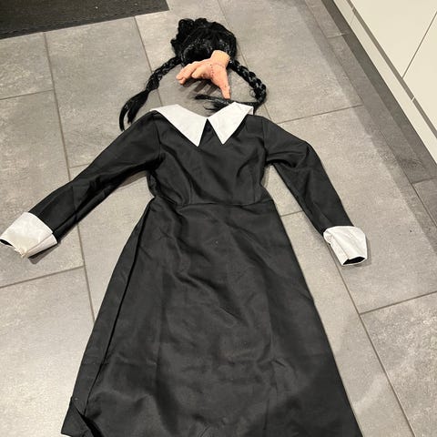 Rubie's kostume (Anna fra Frost) med lilla kappe og sort kjole med orange detaljer. Kostumet har snøredetaljer foran og lange ærmer med orange mønster. Størrelse 7-8 år.