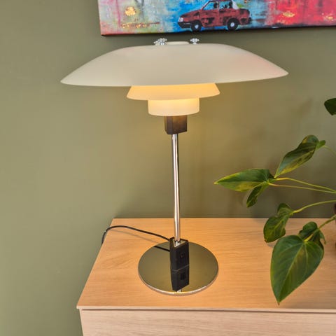 Ikonisk Louis Poulsen PH bordlampe designet af Poul Henningsen. Lampen er udført med den klassiske flerskærms-konstruktion i hvidt, der sikrer et behageligt og blændfrit lys. Standeren og foden i højglansforkromet metal står i smuk kontrast.