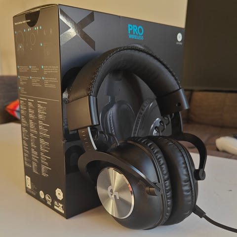 Logitech G trådløst gaming headset med sort farve. Headsettet inkluderer en mikrofon og leveres med en opbevaringspose. Næsten ikke brugt