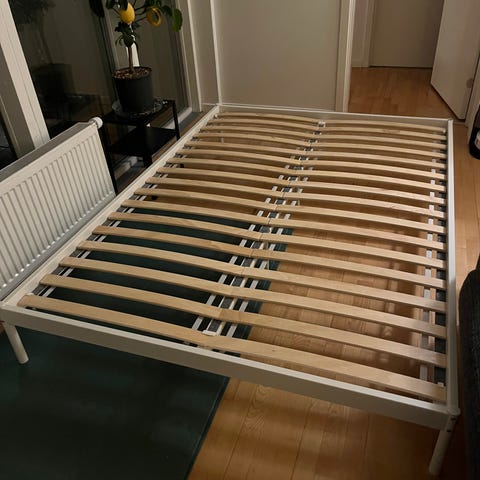 Meget fint Sengestel fra ikea. Selve rammen og gavlen er i træ, hvor benene og diverse stænger der samler delene er i hvidmalet metal