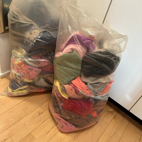 Indhold af de to plastsække med tøj er: