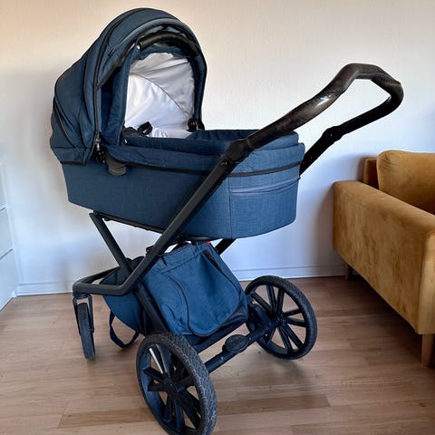 Odder Vida fra 2021 med lift, madrasser, regnslag, myggenet og sele. Velholdt. Brugt til 1 barn