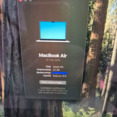 Sælger en bærbar computer, næsten ikke brugt siden 12. December 2025, primært hjemme. Kun 4 battericyklusser og 100% batterisundhed. Stadig dækket af Apples begrænsede garanti.