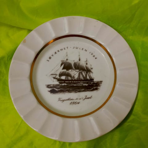 Kongelig Dansk Porcelæn jubilæumsplatte med motiv af et sejlskib og teksten 'KGH 1774 - 1974'. Platen er rund med en blå og hvid farveskala og har en guldkant. Den markerer 200 års jubilæum.