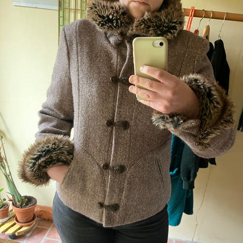 Uldfrakke med 50% uld. Klassisk figursyet snit, med knappe detaljer på skuldrene og synlige syninger. Har købt den for lille, så kun brugt den to gange - derfor som ny.
