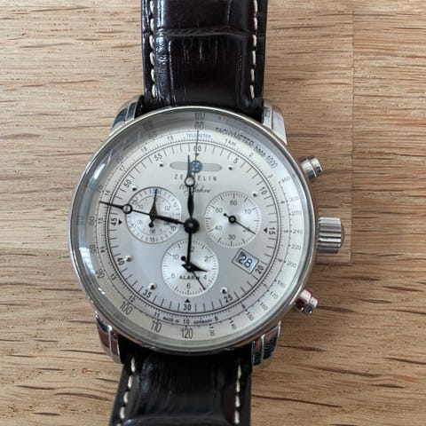 Sælger dette flotte 100 Years Zeppelin Chronograph Alarm 7680-1 ur med sort rem