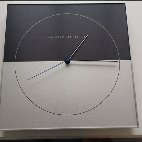 JACOB JENSEN vægur til unisex med et minimalistisk design bestående af en sort firkantet ramme og en hvid urskive. Uret har to sorte visere og et enkelt udtryk uden tal eller markeringer.