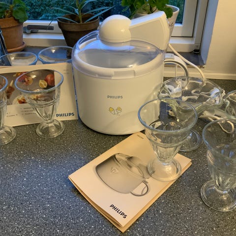 Philips Delizio ismaskine med aftagelige dele for nem rengøring. Inkluderer skål, låg med isrører, fryseskål og motorenhed. Hvid farve med gennemsigtigt låg. Elektrisk drevet med ledning - fungerer fint