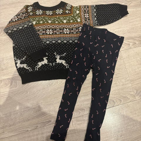 Sætter består af striktrøje og leggings med julemotiver.