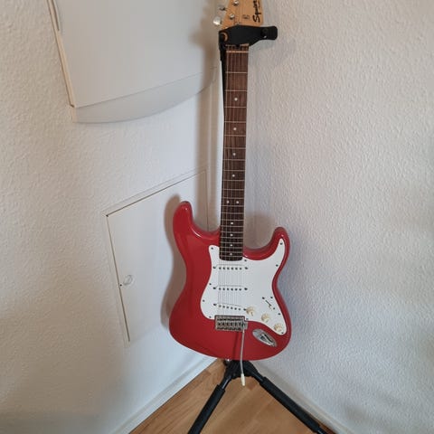 Fin begyndersæt som inkludere Supreme Strat elektrisk guitar, Peavey Rage 158 (15watt) guitarforstærker, originale guitar taske, læderrem og stativ.