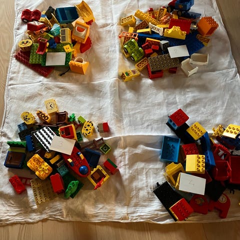 Ca 50 stk. Forskellige former, mini figure, en båd, en håndvask og vinduer er blandt dette mixede lot. Sjovt supplement til de øvrige lidt mere almindelige duplo klodser.