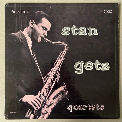 Fem Stan Getz lp-plader: Gerry Mulligan Meets Stan Getz (Verve 1957) vg+:vg-, Stan Meets Chet Baker (Verve 1958) vg/vg, More West Coast Jazz (Verve 1961-63) vg+/vg, Greatest Hits (Prestige 1963) vg+/vg, Stan Getz and J.J. Johnson at the Opera House (Verve 1962) nm/vg+ [5]