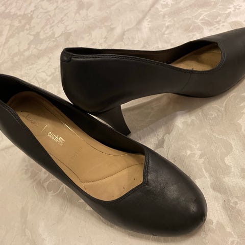 Clarks højhælet sko i størrelse 38. Skoene er grå og har en rem med spænde over vristen. Materialet fremstår som ruskind eller lignende tekstur.