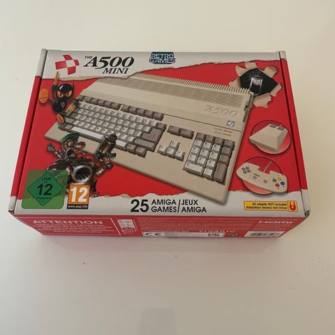 Commodore A500 Mini spilkonsol med integreret tastatur, mus og spilcontroller. Konsollen er designet til retro gaming og leveres med 25 forudinstallerede Amiga-spil. Farve: beige. Tilslutning via USB.