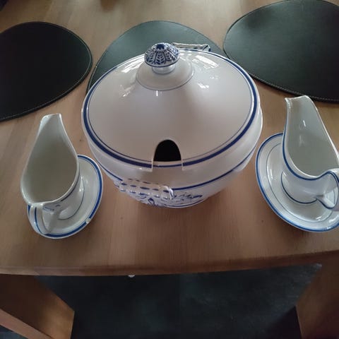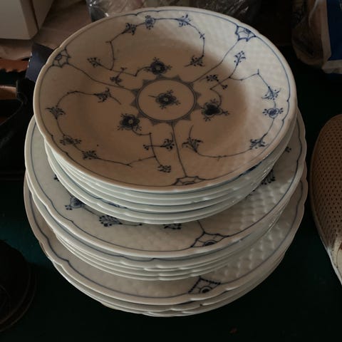 tallerken med blå dekoration. Tallerkenen har en rund form med et dekorativt mønster i blå farve på hvid baggrund. Materialet er porcelæn.