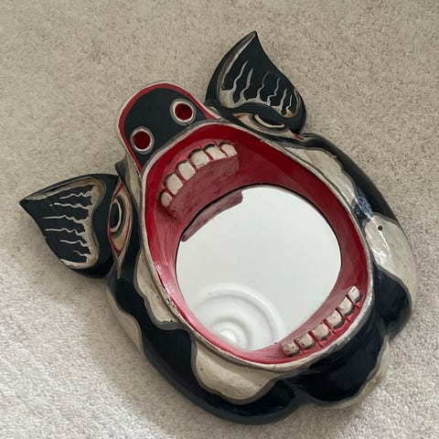 Købt i en butik på Frederiksberg, der desværre ikke eksisterer længere. Spejlet er lavet af genbrugs træ og buer derfor en smule, man kan derfor komme til at se en smule lavere ud i spejlet😂 men smukt og dekorativt er det uden tvivl.