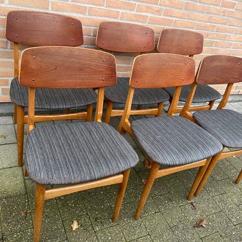 4 stk velholdte spisestole i teak polstret på sæde og ryg.