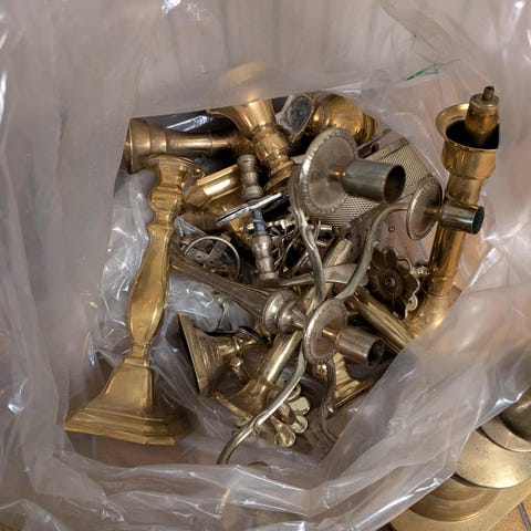 2 lysestager, 1 krukkeskjuler og en mini skovl i messing