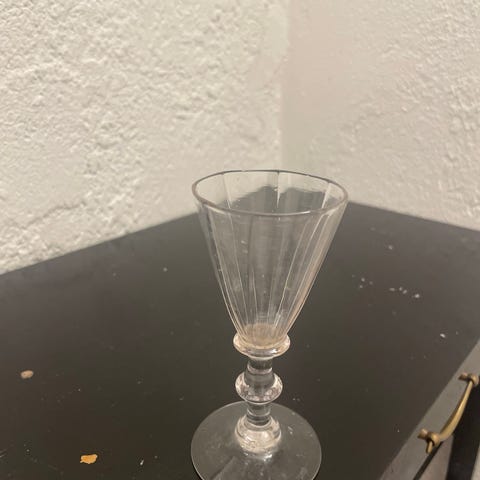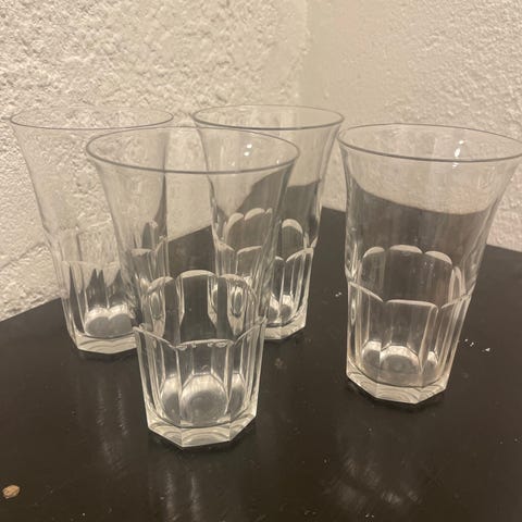 To blå glas drikkeglas med fod. Glassene har en let konisk form og er let bølgede. Formen hedder måske snerleglas eller spidsform