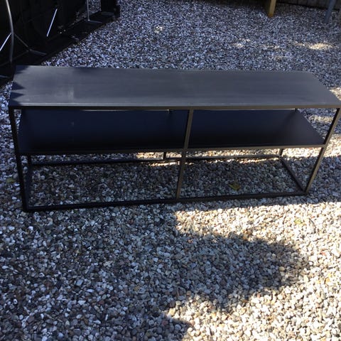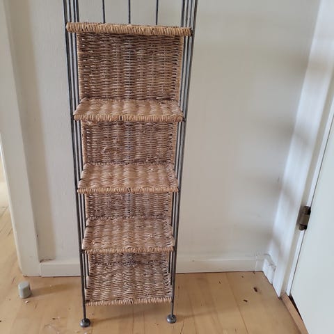 En lille reol i metal som kan klappes sammen og er 65 cm høj 35 cm bred 18 cm dyb