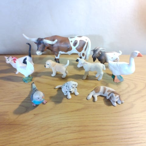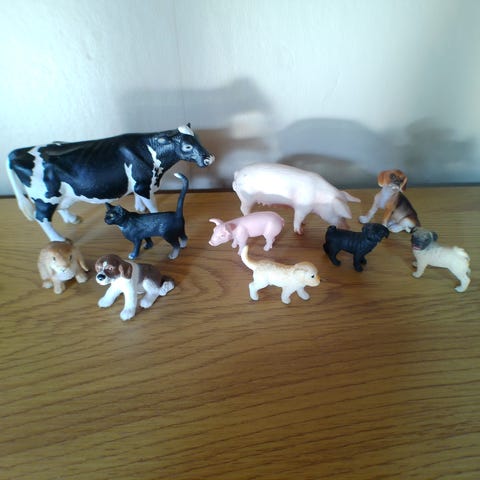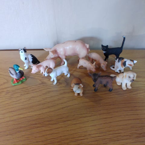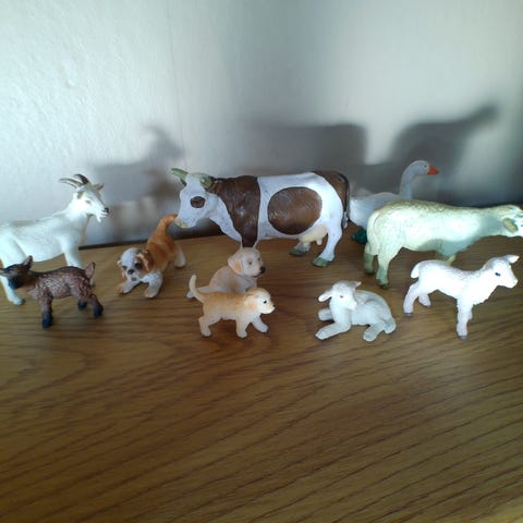 12 Figurer.. Alle er Schleich og i standen som ses på billedet. Figurerne sælges kun sammen i den pakke der er vist, Ingen løssalg. Sender med fast pris uanset vægt og antal af lots med DAO til 47kr.. Inkluderer: Gås, Kalv, Ged, Hunde, Kat, Lam, Kaniner, Killing