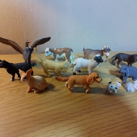 10 Figurer.. Alle er Schleich og i standen som ses på billedet. Figurerne sælges kun sammen i den pakke der er vist, Ingen løssalg. Sender med fast pris uanset vægt og antal af lots med DAO til 47kr.. Inkluderer: Køer, Hunde, Får, Gris, Kat