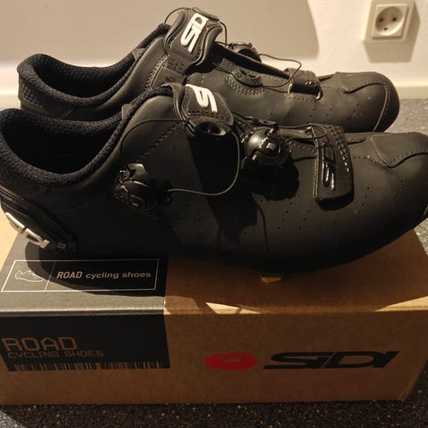 Sidi Ergo 3 Carbon cykelsko i størrelse 46. Skoene er sorte og lavet med carbon såler for øget stivhed og effektiv kraftoverførsel. De har justerbare spænder for en sikker og tilpasset pasform. Designet til cyklister, der ønsker præcision og komfort under kørsel.