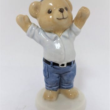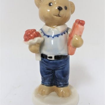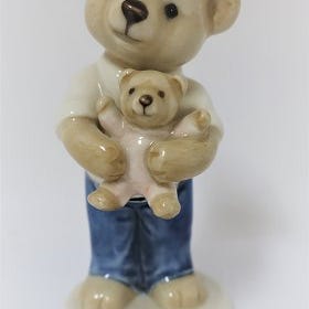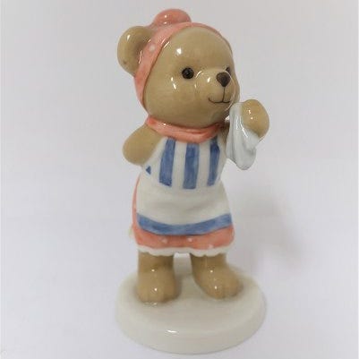 Victor og Victoria, Bing og Grøndahl, 2001, Victoria er ved at bade babyen, mens Victor er i badekåbe med en lille, gul fugl.