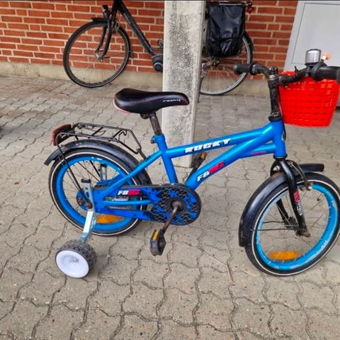 Rex børnecykel med 16 tommer hjul, blå ramme, støttehjul og rød plastik kurv monteret foran. Cyklen har sort sæde og styr med orange håndtag.