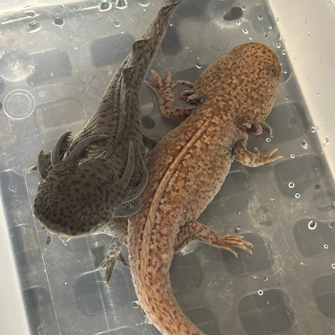 2 flotte axolotler sælges, hvide med røde og brunlig fjeraktige gælder. De er Ca. 18 - 20 cm.