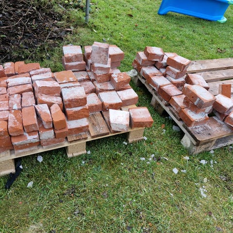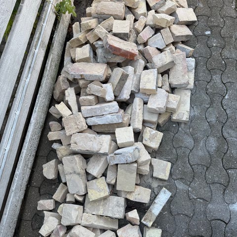 Blandet mursten i forskellige farver og størrelser. Ca. 70-100 stk. Der er primært gule sten, men også enkelte røde. Nogle er med mørtel på og andre er ikke. Stammer fra en nedtaget væg.