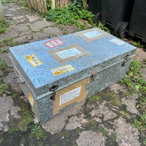 Kufferten er 100 cm lang, 60 cm bred og 35 cm høj.