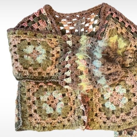 Uld og polyester-tæppe hæklet i bedstemor-tern, netop hæklet færdig, aldrig brugt.