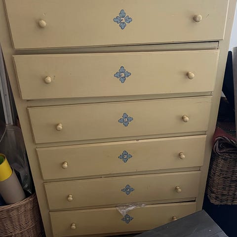 Fed retro kommode, med brugstegn som ses på billeder. Kan evt. shines op med slibning og lak, maling eller tapet🌸