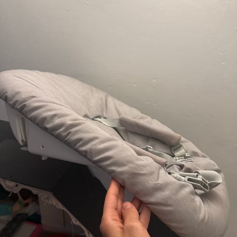 Stokke højstol med polstret sæde og sikkerhedssele. Højstolen er designet til børn og har en robust konstruktion i plast og stof. Farven er beige, og stolen er egnet til brug ved måltider og andre aktiviteter for børn.