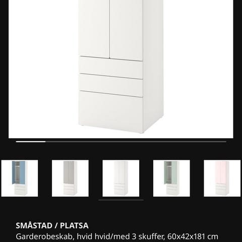3 stk. IKEA SMÅSTAD skabe fra IKEA, hver i størrelsen 60 × 30 × 60 cm. Skabene har fået eftermonterede messinggreb.