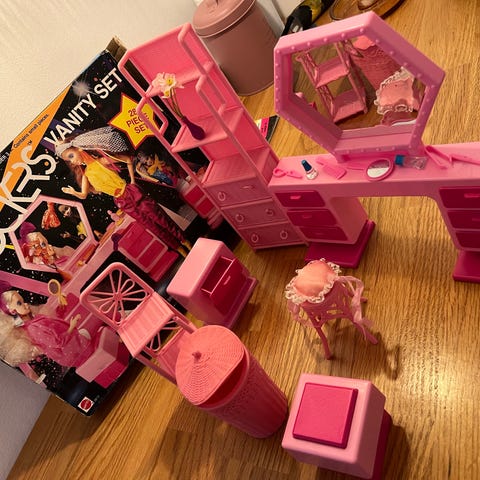 Mattel Barbie møbler fra 1984 sælges samlet. Møblerne stammer fra samme periode og matcher hinanden i stil og farver.