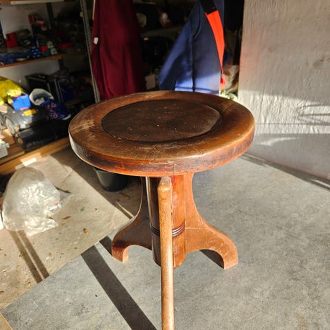 Klaverstol - fin og antik klaverstol. Justerbar i højden (skrues op og ned). Sæde Ø37. Brunt bejdset og lakeret træ. Efter mange års brug trænger den til lidt "møbelwellness", men er i god stand efter alderen.
