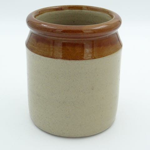 Moira Stoneware krukke med en højde på ca. 6 cm. Fremstillet i stentøj med brun og grå farve. Håndlavet i England.
