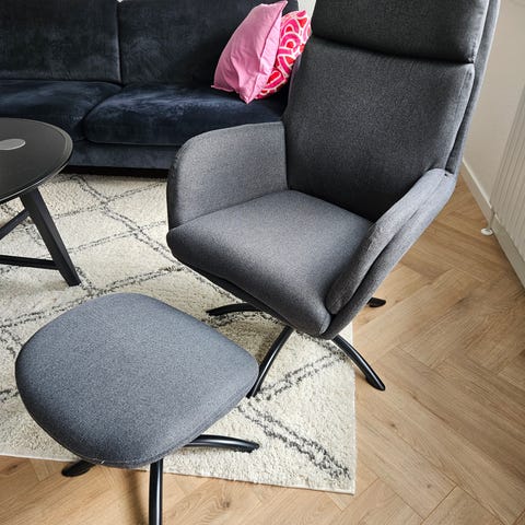 Grå lænestol med fodskammel sælges. Pæn og velholdt.