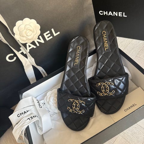 Chanel Sandaler i størrelse 39, sort farve. Sandalerne har justerbare remme med guldknapper . Størrelse 39.5