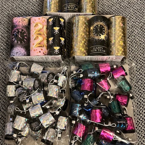 Er brændt inde med ca 20 poser partypoppers i sølv og sort glitter.