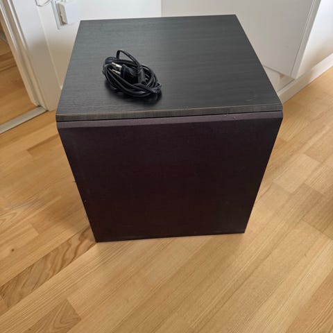 Argon BassM2 Subwoofer med tilslutningsmuligheder via RCA og optisk indgang. Enheden har justerbar volumen, crossover og fasekontrol. Designet til brug i lydsystemer for at levere dyb bas.