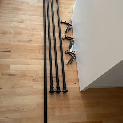 3 stænger, 2 beslag, er i pæn stand. Den ene mangler en dut for enden men kan købes i Ikea