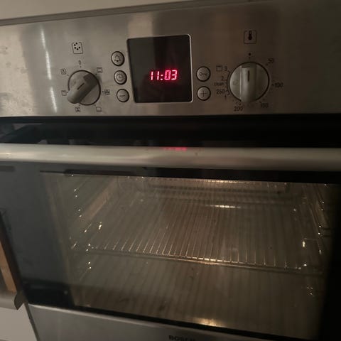 Indbygningsovn med varmluftsfunktion. Ovnen har rustfrit stål front og tre betjeningsknapper. Den indvendige ovnrum er sort med ovnriste og bageplade. 5 indstillingshøjder. Ren og fin indvendig