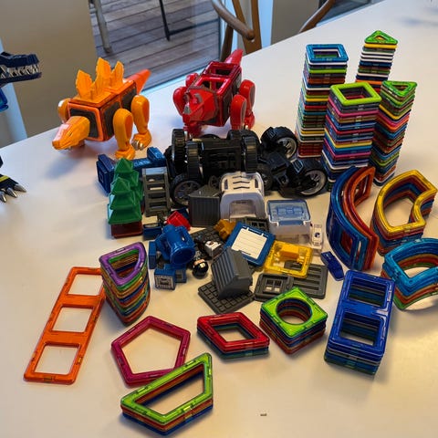 Magformers, 40 firkanter, 16 trekanter, 8 "buede trekanter" 4 "runde" og 4 der kan bygges til kegle + inspirationsbog