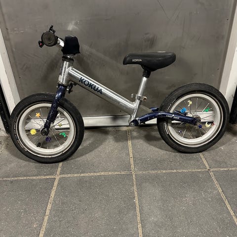 Kokua Balancecykel med 12 tommer hjul. Farve: sølv. Designet til børn for at lære balance og cykling uden pedaler.