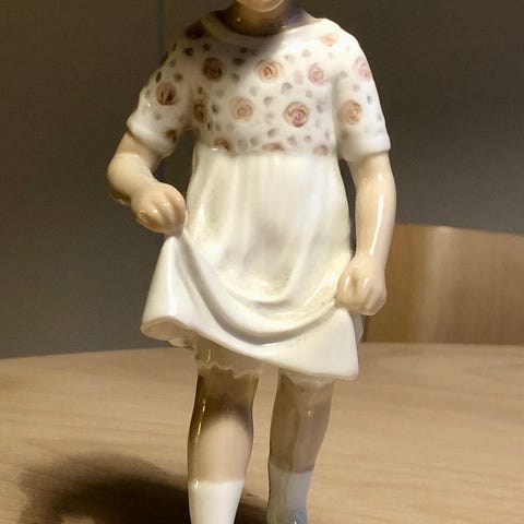B&G figur af en pige med en hund Fremstillet i porcelæn med blå og hvide farver. Figuren viser en pige i blå bluse og hvid nederdel, der sidder på knæ med en hund