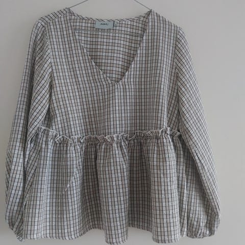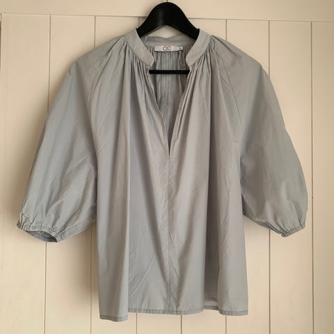Fin bluse, med knaplukning i nakken. Der er desværre 2 løse tråde på det ene ærme, ellers rigtig fin.