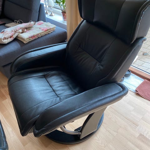 To lænestole i sort, bonded læder med to tilhørende skamler (kun en er vist på billederne).